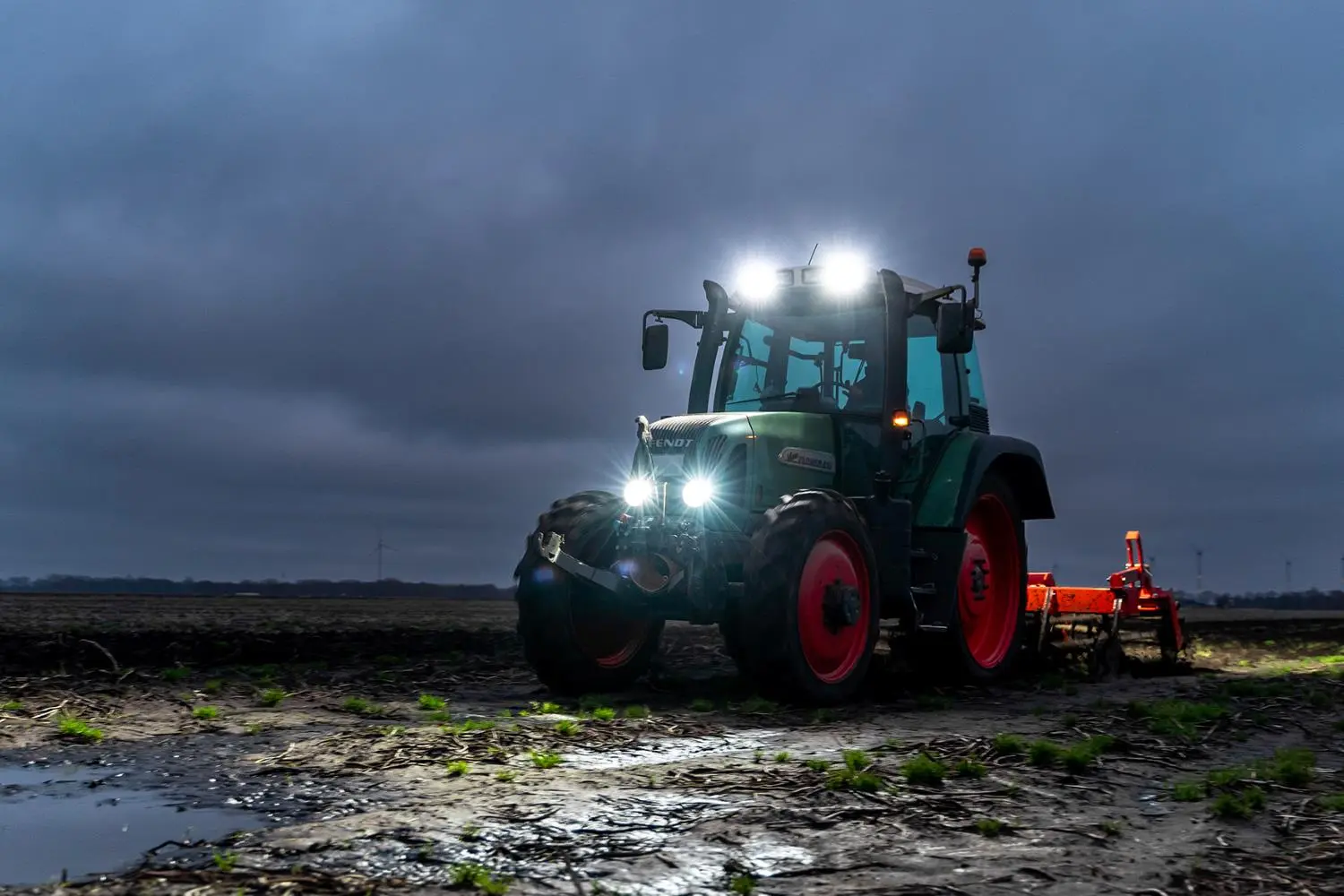 Zielony ciągnik z jasnymi reflektorami roboczymi LED oświetlający pole nocą