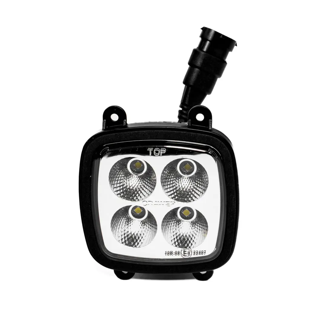 Lampa CRAWER została wyposażona w system tłumienia zakłóceń radiowych EMC Klasa CISPR 4, dzięki czemu nie wpływa negatywnie na działanie radia ani innych urządzeń elektronicznych w kabinie. Montaż przebiega wyjątkowo łatwo – wystarczy odkręcić cztery śruby, wymienić lampę i ponownie je przykręcić. Dzięki wtyczce H11 i konstrukcji dopasowanej do oryginalnej obudowy John Deere nie ma potrzeby przerabiania instalacji elektrycznej.