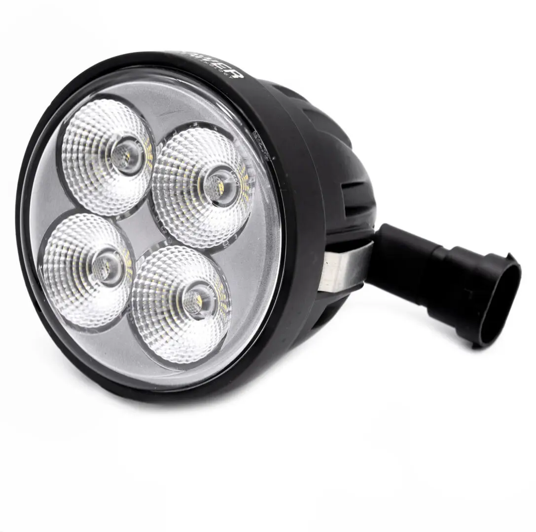 Wykonana z trwałego, proszkowo lakierowanego aluminium obudowa oraz klosz z PMMA zapewniają lampie odporność na uszkodzenia mechaniczne i wibracje. Dzięki klasie ochrony IP67 lampa jest całkowicie odporna na wodę i pył, co gwarantuje długotrwałe użytkowanie bez obaw o warunki atmosferyczne. Połączenie odbywa się poprzez standardową wtyczkę H9, co umożliwia szybki i bezproblemowy montaż w miejscu fabrycznej lampy. Model spełnia normę CISPR 4, dzięki czemu nie powoduje zakłóceń radiowych i współpracuje bezproblemowo z elektroniką ciągnika. Żywotność przekraczająca 30 000 godzin sprawia, że lampa jest niezawodnym wyborem na wiele sezonów pracy.