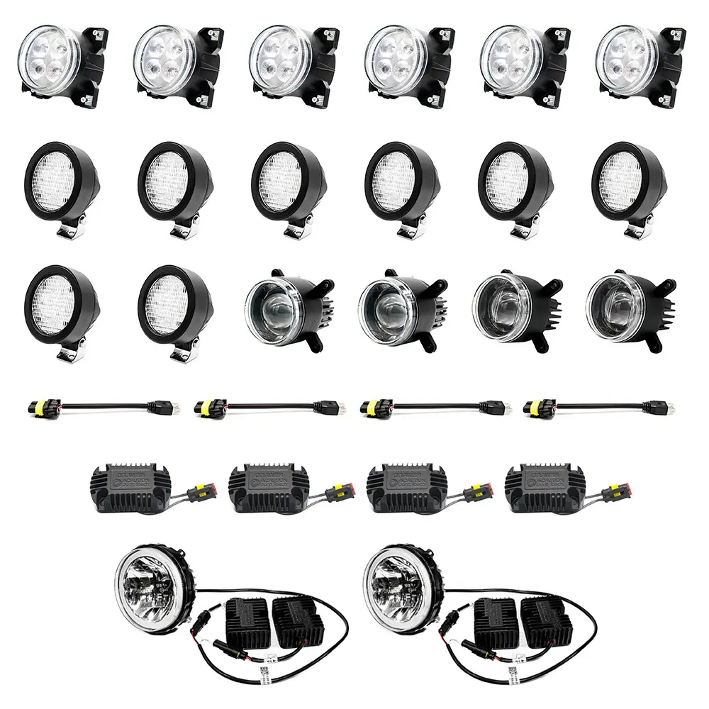 Kompletny pakiet LED do ciągników Fendt serii 800 i 900 SCR to zestaw typu plug & play, który umożliwia szybką i bezpieczną wymianę fabrycznego oświetlenia na nowoczesne lampy LED. Wszystkie komponenty zostały dopasowane pod względem technicznym oraz montażowym – zastosowano złącza przejściowe, dzięki którym instalacja odbywa się bez przeróbek wiązki. W zestawie znajdują się również specjalne rezystory – dwa do każdej przedniej lampy CR-3020R – które zapewniają prawidłowe działanie systemu oświetlenia. Pakiet obejmuje również światła drogowe oraz mijania wraz z odpowiednimi adapterami, które pozwalają zachować pełną kompatybilność z instalacją ciągnika, jak i również rezystory, po jednym na lampę.