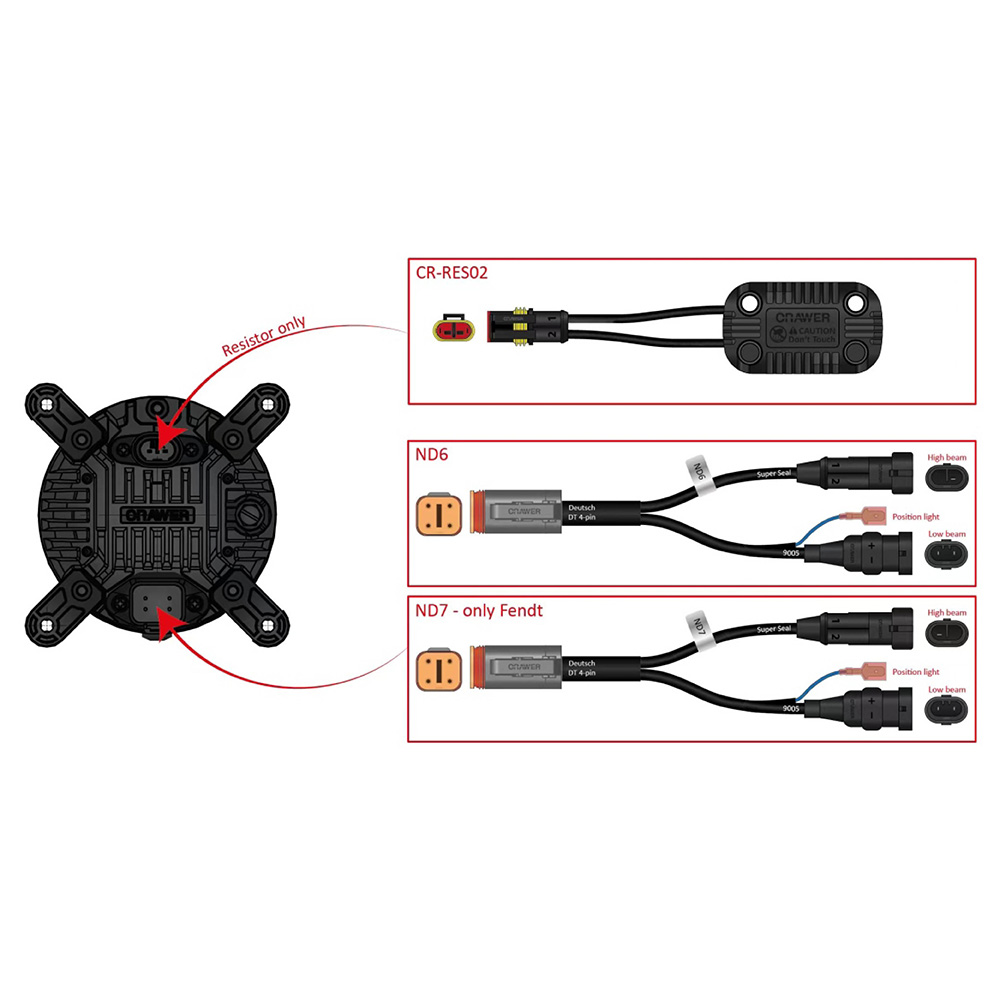 Lampy przednie CRAWER Hyperios LED 90 mm łączą w sobie trzy funkcje: światła drogowe, mijania oraz ring jako światło postojowe, dzięki czemu zastępuje kilka tradycyjnych reflektorów jednym nowoczesnym rozwiązaniem. Zastosowane złącze Deutsch DT 4-pin oraz możliwość użycia adaptera przejściowego zapewniają szybki i bezproblemowy montaż typu Plug & Play, bez konieczności przerabiania instalacji elektrycznej. Dzięki tłumieniu zakłóceń radiowych klasy CISPR 4 (EMC) lampa nie wpływa na pracę radia ani systemów pokładowych ciągnika.